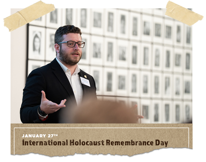 Photo: Harry Smith speaks to an audience at The Zekelman Holocaust Center in his role as Senior Education Program Manager.